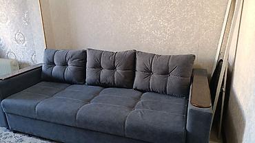 Раскладной диван. Серый диван-кровать с тканевой обивкой, оснащенный механизмом трансформации для создания дополнительного спального места. Модель имеет встроенный ящик для хранения белья, что позв...