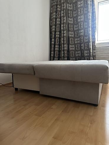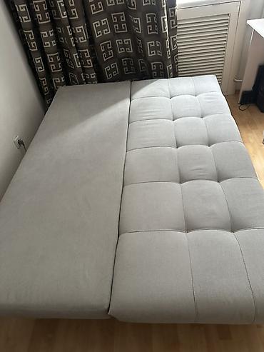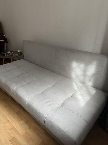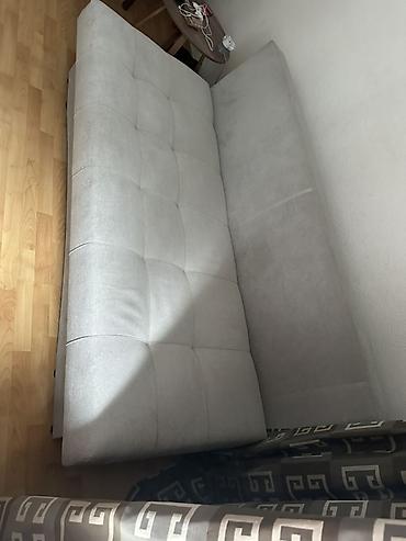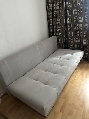 Прямой раскладной диван-кровать светло‑серого цвета. цена крават 27 Тич стол 18 тич - Механизм трансформации: выкатной/еврокнижка — сиденье выдвигается, спинка опускается, образуя ровное спальное м...