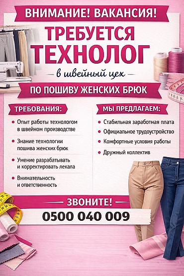Топчу петля, кнопка, блочкиге опыты бар жумушчулар керек. Постоянно иштегенге —————————————————— Жумуш коп. машинкалар жаны, автомат. —————————————————— Адрес : Восток 5. Б.Мамбетова/Т.АйтматоваДоговорная