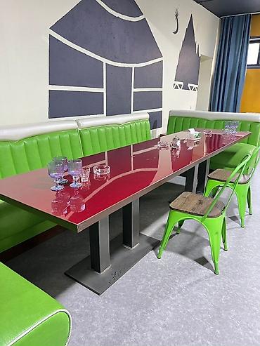 - Комната отдыха: длинный обеденный стол на металлическом основании с глянцевой столешницей, стационарные мягкие диваны по периметру и дополнительные стулья.