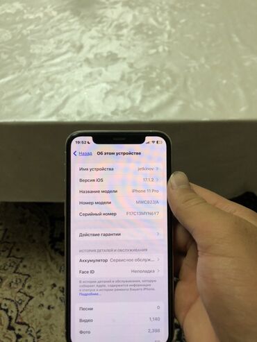 iPhone 11 ProСмартфон Apple iPhone 11 Pro белого цвета, работающий на операционной системе iOS версии 17.1.2. Модель оснащена функцией Face ID. Устройство предлагает широкие возможности для хранения мультимедиа с 1540 видеозаписями и 2398 фотографиями. Аккумулятор требует обслуживания, его максимальная емкость составляет 72%.