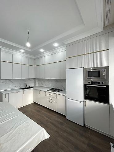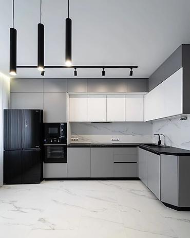 Современный кухонный гарнитур в минималистичном стиле, выполненный в светлых тонах с акцентами черного цвета. Кухня оснащена встроенной бытовой техникой, включая духовку, микроволновую печь и варочную панель. Фасады шкафов выполнены из матового материала, что придает гарнитуру элегантный вид. Верхние шкафы выполнены в комбинации закрытых секций и секций со стеклянными дверцами, что позволяет удобно хранить и демонстрировать посуду. Нижние шкафы обеспечивают достаточно места для хранения кухонной утвари. Столешница и фартук выполнены из материала, имитирующего мрамор, что добавляет изысканности интерьеру. Черная мойка и смеситель гармонично дополняют общий дизайн. Гарнитур подходит для современных интерьеров, обеспечивая функциональность и эстетику.