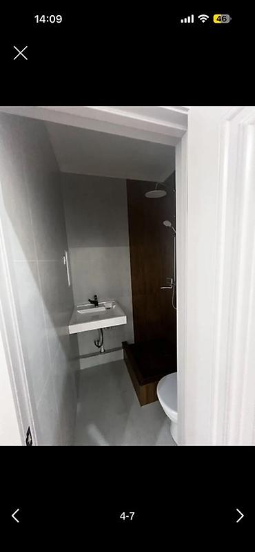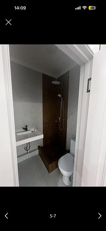 - Санузел: инсталляция унитаза, раковина с современным смесителем, душевая зона с высоким поддоном/подиумом отделанным под дерево, верхний «тропический» душ и ручная лейка, светлая керамогранитная плитка.