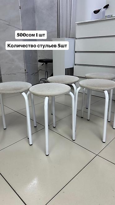 2) Табуреты на белом металлическом каркасе, круглая мягкая сидушка светлого цвета. Удобны для кухни, салона, дополнительной посадки.