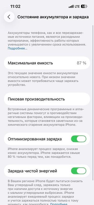 - Аккумулятор: максимальная ёмкость 87% (на скриншоте), включены «Оптимизированная зарядка» и «Зарядка чистой энергией»