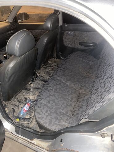 - Передние сиденья с чехлами, задний диван сплошной, тканевая обивка с серым узором.