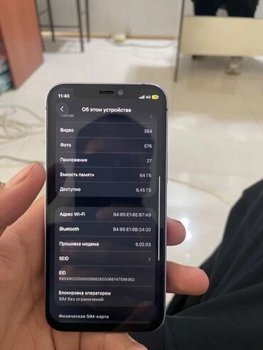 - Показаны адреса Wi‑Fi/Bluetooth, прошивка модема 6.02.03, EID/SEID