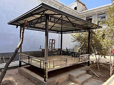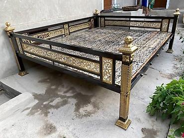 - Оригинальные металлические тахты/площадки для отдыха: массивная рама, резные вставки, декоративные столбы и накладки под «золото», готово для установки матов/ковров.