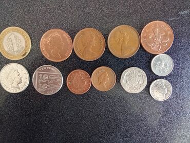 - Также присутствуют несколько старых британских пенсовых монет увеличенного диаметра с различными портретами Елизаветы II и легендами (D·G·REG·F·D и др.).