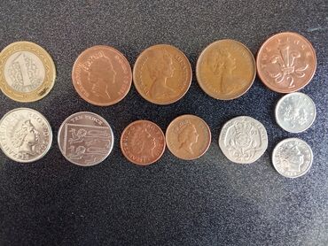 - Встречаются как современные оборотные британские монеты, так и более ранние варианты дизайна.