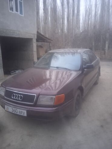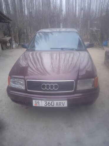Audi 100 C4 седан, бордовый цвет. Правильный классический дизайн: прямоугольная оптика, фирменная решётка с четырьмя кольцами, широкие бамперы. Кузов 4‑дверный, тонированные стекла, антенна «акулий плавник». Колёса на стальных дисках.