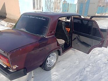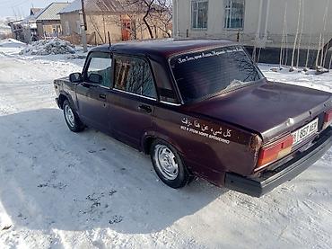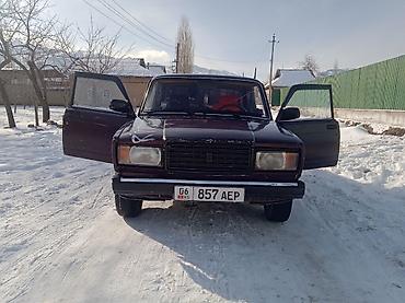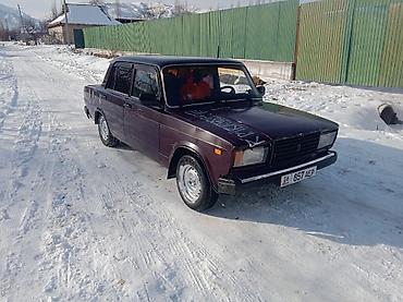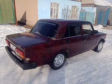 Автомобиль: классический седан ВАЗ 2107 (жигули), 4 двери, задний привод. Цвет кузова — темно-бордовый. На заднем стекле декоративные наклейки, установлена радиоинская антенна на крыше. Регистрационные номера KG (Киргизия) видны на фото.