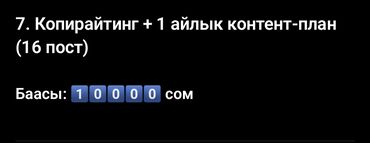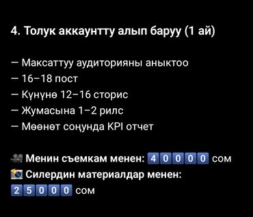 SMM-услуги в Бишкеке. Предлагается ведение 2 проектов: - Контент-съёмки 2 раза в неделю - Подготовка и публикация 12 постов в месяц Подходит для бизнеса, которому нужны регулярные фото/видео-съём...