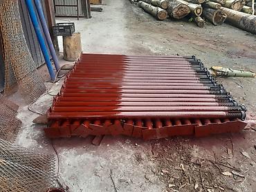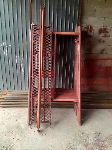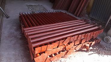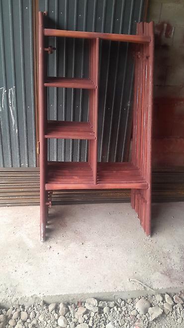 - Комплект рамных строительных лесов из стальных труб. Покрытие — антикоррозийный грунт красно-коричневого цвета.