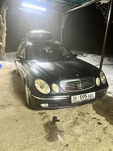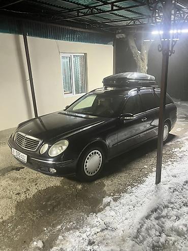 Mercedes‑Benz E‑Class универсал (W211), черный цвет. Просторный салон и большой багажник, дополнительно установлен багажный бокс на крыше и поперечины — удобно для поездок и перевозки вещей.