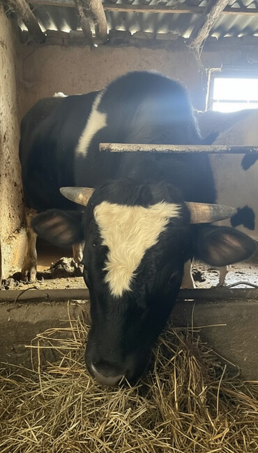 Бык-производитель, чёрно-пёстрый окрас. Крупный, сильный, с широкой грудью и хорошо развитыми мышцами. Содержится в крытом загоне, на привязи, с кормушкой для сена. На фото — реальное животное, спо...