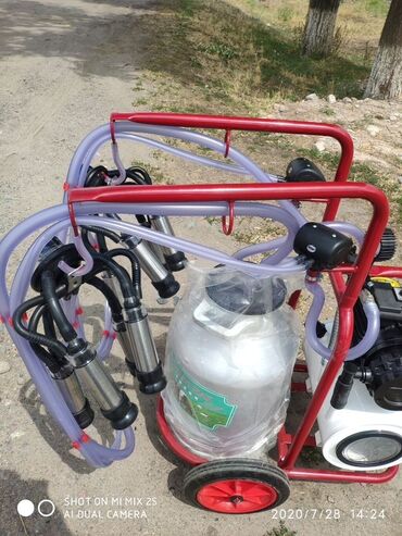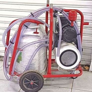 - Комплектация по фото: рама с колесами и ручкой, электродвигатель с вакуумным насосом и ресивером, две доильные подвески, молочные и вакуумные магистрали, молочная фляга с крышкой.