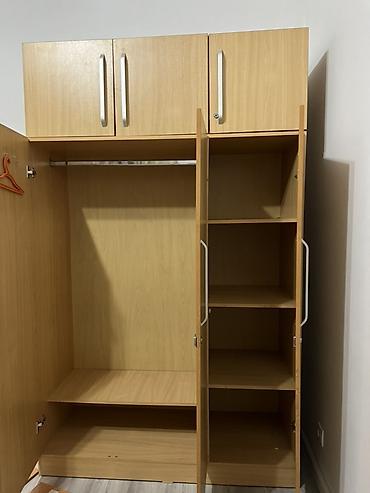 - Левая секция: отделение для одежды на вешалках, внизу широкая полка и ниша для обуви/коробок