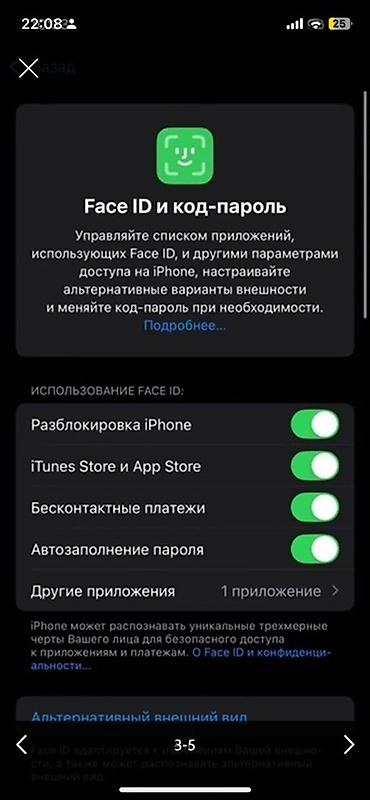 - Биометрия: Face ID — работает для разблокировки, покупок в iTunes и App Store, бесконтактных платежей и автозаполнения паролей (все переключатели активны на скриншоте)
