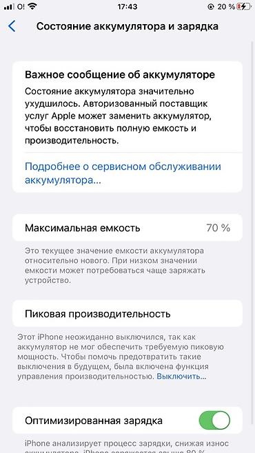 - Аккумулятор: максимальная емкость 70%; отображается важное сообщение о батарее, активирована функция управления производительностью; оптимизированная зарядка включена