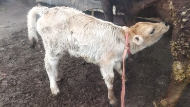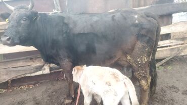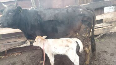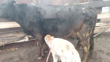 Продаётся корова с тёлочкой отелилась 2 недели назад в данный момент 12-13 л молока даёт. Коровa с телёнком (корова черная, рогатая; телёнок светлый, на привязи).