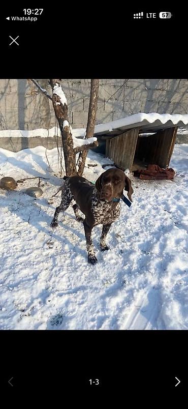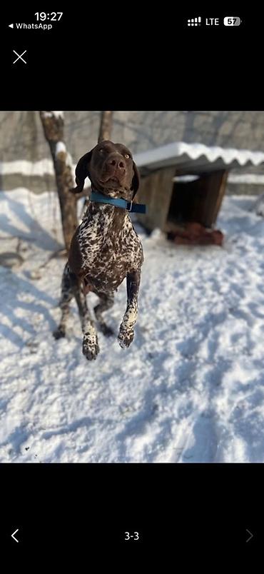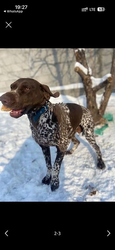 Порода: дратхаар (немецкая жесткошёрстная легавая). Описание: - Молодая активная собака с характерным жестким «бородатым» подпалом и бело-крапчатой окраской лап и груди. - Окрас: коричневый с бело...