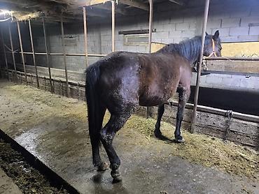 Лошадь (мерин/кобыла не указано), масть гнедо-бурая. На фото — в недоуздке, стоит на привязи в крытом деннике/навесе. Характеристики: - Рост примерно средний (ориентировочно 150–160 см в холке). -...