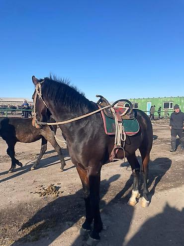 Лошадь верховая, масть гнедая с темной гривой и хвостом. Круп крепкий, высокий рост; правильная постановка ног, широкая грудь. На фото — в рабочей сбруе: кожаное седло с вальтрапом, уздечка с верёвочным недоуздком/поводом. Спокойный взгляд, уравновешенный темперамент; подходит для прогулок под седлом и хозяйственных работ. Хорошо держит шаг, рысь; уверенно стоит под седлом, не пугливая. Удобная посадка благодаря мягкому вальтрапу и высокой луке седла. Подойдёт всадникам с базовыми навыками, для выездок по полям, обучения и турпрогулок.