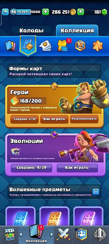 - Открыт раздел «Колоды» и «Коллекция», доступ к героям, эволюциям и волшебным предметам.
