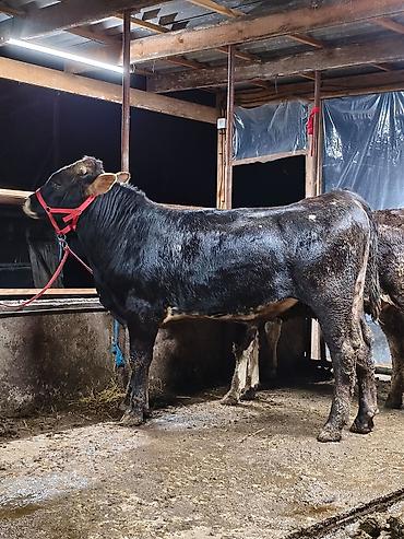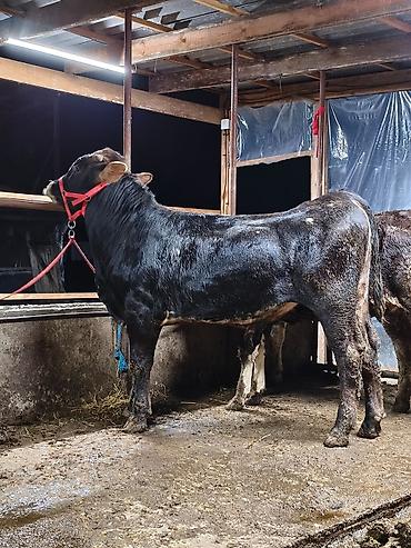 Бычек(чёрный окрас), биркованный. - Вид: крупный рогатый скот, молодняк. - Окрас: сплошной тёмный, светлые копыта. - Уши с идентификационными бирками, на морде — недоуздок. - Содержится в стойл...