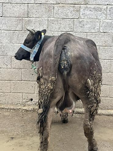Бык молодняк, темно-бурой масти, рогатый. На ушах — бирки идентификации. Животное на недоуздке с прочным ремнем и верёвочным поводом.