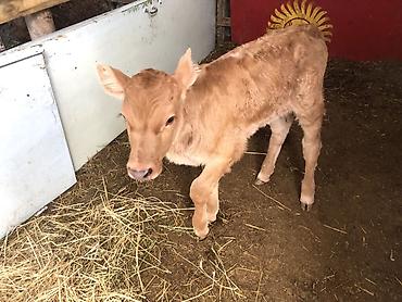 Телёнок (молодняк КРС) - Окрас: светло-рыжий с белыми участками. - Уши компактные, лоб широкий, крепкие ножки. - Содержится в тёплом стойле на подстилке из соломы, есть поилка/кормушка. - Подходит...
