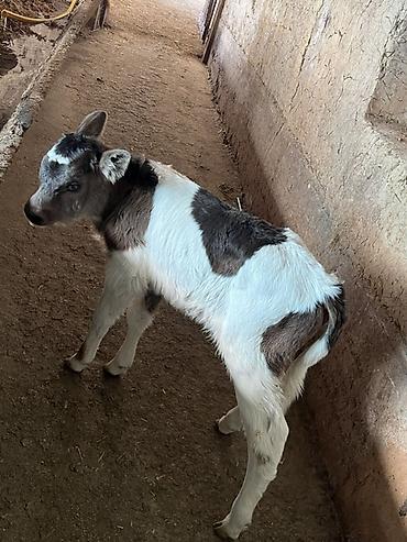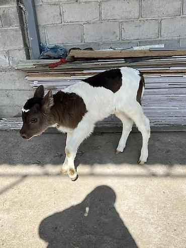 - Молодой телёнок с контрастным пятнистым окрасом (белые и тёмно-коричневые/серые участки).