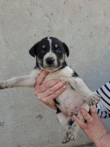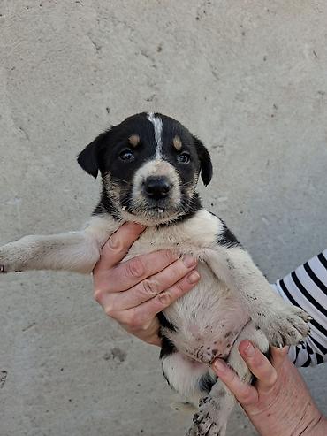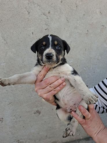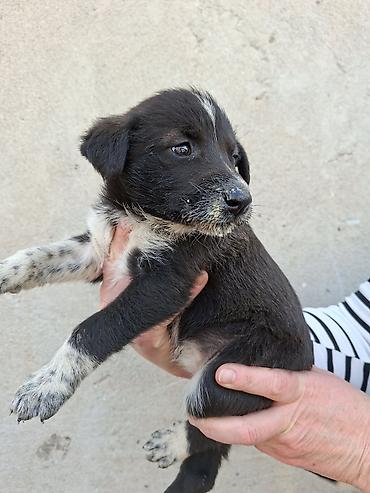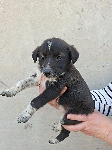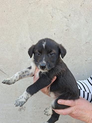 Щенки средних размеров, помесь дворняжек/пастушьих типов. Возраст — примерно 1–1,5 месяца (по виду молочные клыки только прорезаются). Окрас оригинальный: черный с белыми и пепельно-пятнистыми отметинами на лапах, груди и мордочке; у некоторых щенков характерная белая полоска на лбу. Лапы крепкие, корпус плотный, хвост с белым кончиком.