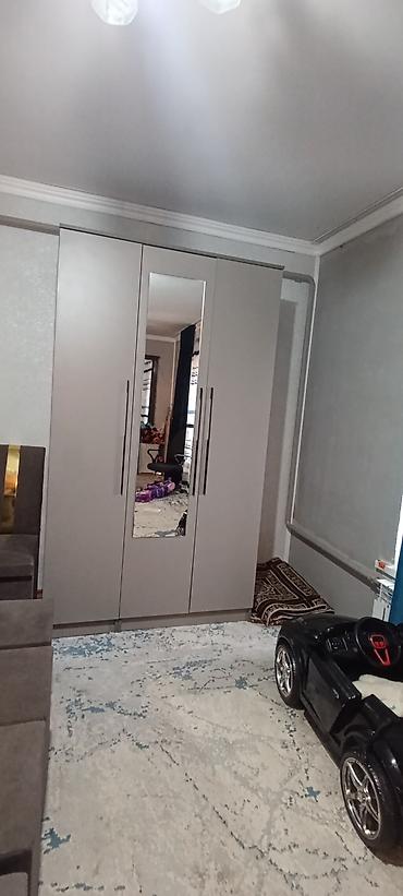 Шкаф- распашного типа, 3-дверный, современный дизайн в матовом серо-бежевом цвете. Центральная дверь с высоким зеркалом во весь рост. Длинные вертикальные ручки в тон фасада.