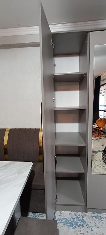 - центральная/правая секция: широкое отделение с металлической штангой для плечиков, верхняя полка-антресоль;