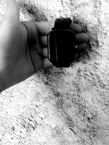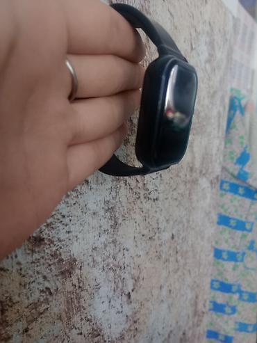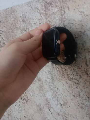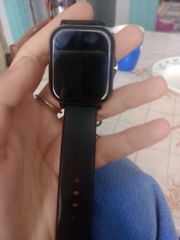 Смарт-часы с прямоугольным сенсорным экраном и черным силиконовым ремешком.