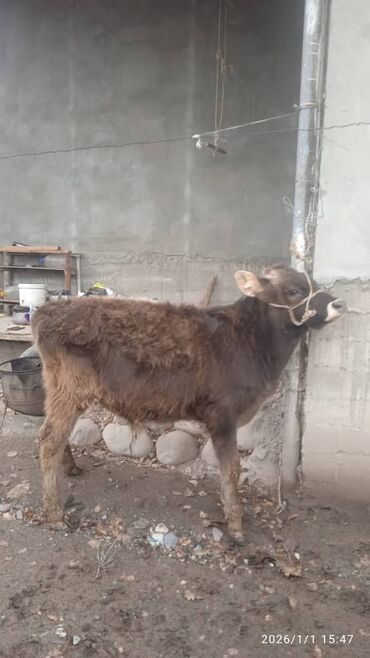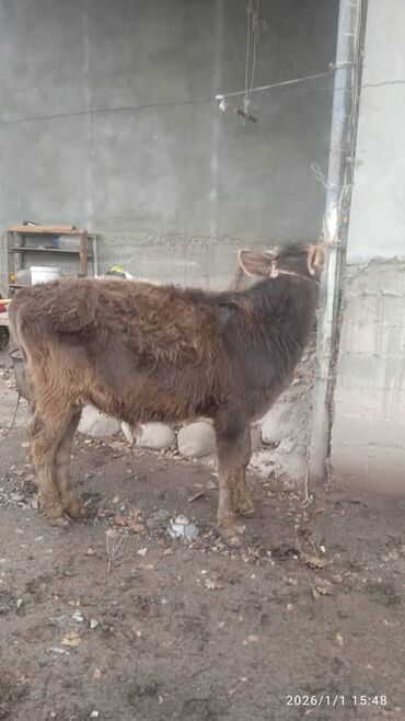 Бык-производитель, чёрно-пёстрый окрас. Крупный, сильный, с широкой грудью и хорошо развитыми мышцами. Содержится в крытом загоне, на привязи, с кормушкой для сена. На фото — реальное животное, спо...