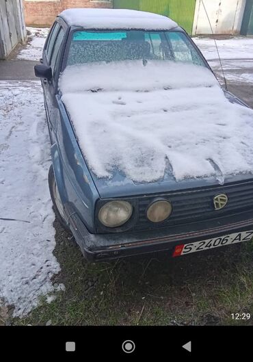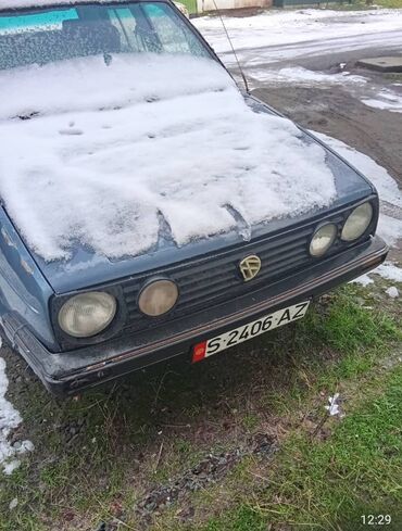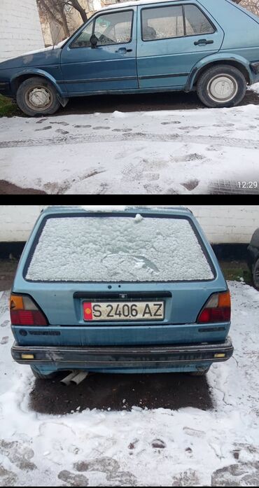 Volkswagen Golf II, пятидверный хэтчбек, синий цвет кузова. Киргизские гос. номера S 2406 AZ. Кузов с пластиковыми расширителями арок и оригинальными колпаками на штампованных дисках. Круглая оптика спереди, черная решетка радиатора, двойной выхлоп. Задняя дверь с большой обзорной площадью стекла, задние фонари классической формы. Бамперы черные, по периметру — защитные молдинги. Антенна на правом крыле. Полный комплект дверей и стекол, наружные зеркала и ручки дверей. Салон пятидверный, удобная посадка и широкий проем багажника. Подходит как практичный городской автомобиль или база для проекта/реставрации классического Golf II.
