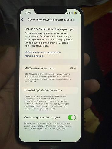 - Аккумулятор: Максимальная ёмкость 76%; в разделе «Состояние аккумулятора» отображается уведомление «Сервисное обслуживание»