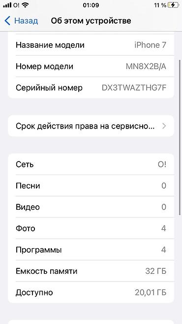 В комплекте — сам смартфон. На скриншотах видны: модель iPhone 7, номер модели MN8X2B/A и серийный номер устройства. Цвет корпуса — чёрный.
