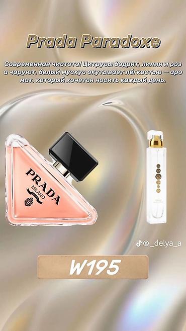 - W195 — вдохновлён Prada Paradoxe. Современная чистота: бодрящие цитрусы, нежные ноты лилии и розы, обволакивающий белый мускус. Лёгкий, воздушный шлейф на каждый день.