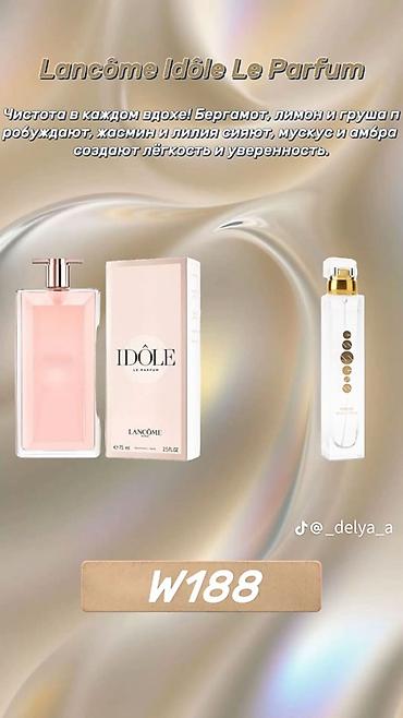 - W188 — вдохновлён Lancôme Idôle Le Parfum. Чистота в каждом вдохе: бергамот, лимон и груша пробуждают, жасмин и лилия сияют, мускус и амбра дарят лёгкость и уверенность.