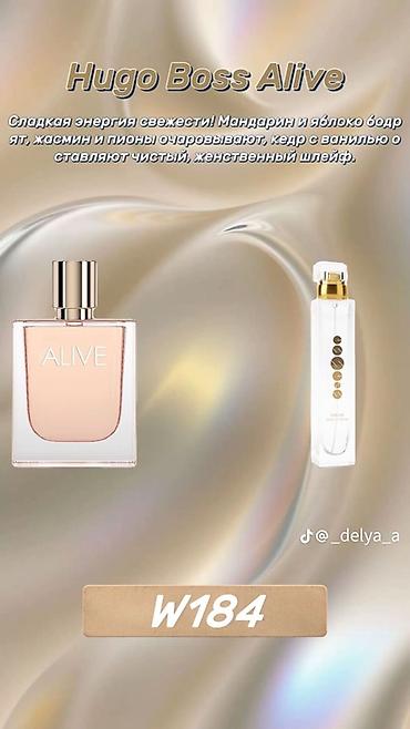 - W184 — вдохновлён Hugo Boss Alive. Сладкая энергия свежести: мандарин и яблоко бодрят, жасмин и пионы очаровывают, кедр с ванилью оставляют чистый, женственный шлейф.