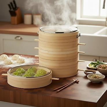 Набор для приготовления и подачи: бамбуковые пароварки + термос‑диспенсер. Бамбуковые пароварки: - Классические круглые паровые корзины из бамбука с крышками. - Несколько секций, можно ставить дру...