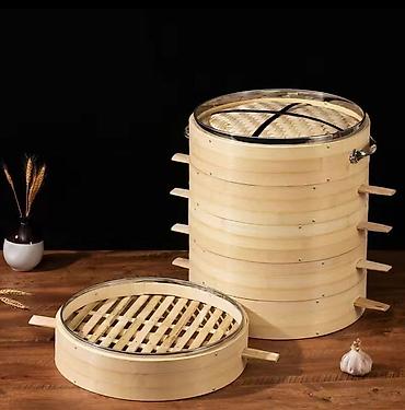 Бамбуковая пароварка Два комплекта, в одном комплекте три яруса и крышка. диаметр 60 см для 180 шт мант - Материал: натуральный бамбук, крышка плетёная. - Конструкция: несколько съёмных ярусов с р...