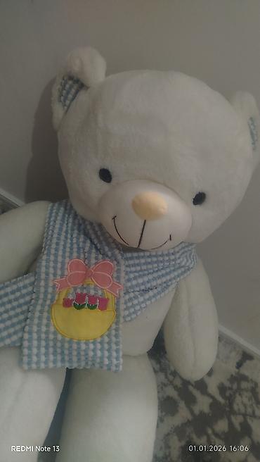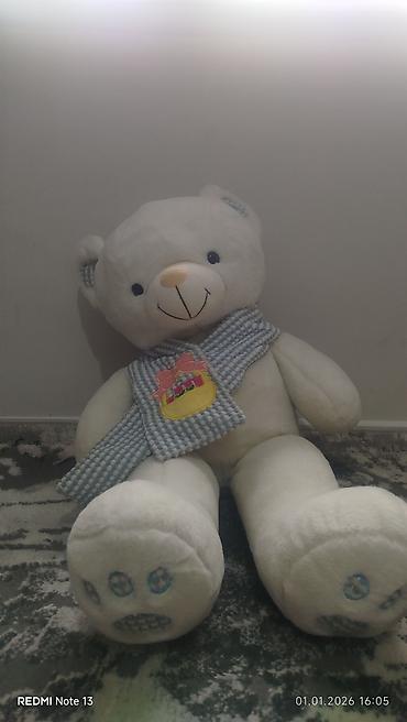 Большой плюшевый медведь белого цвета. - Рост: примерно 120–140 см (по фото — выше среднего плюшевого мишки). - Материал: мягкий ворсистый плюш с рельефной текстурой. - Наполнение: синтетическое (...