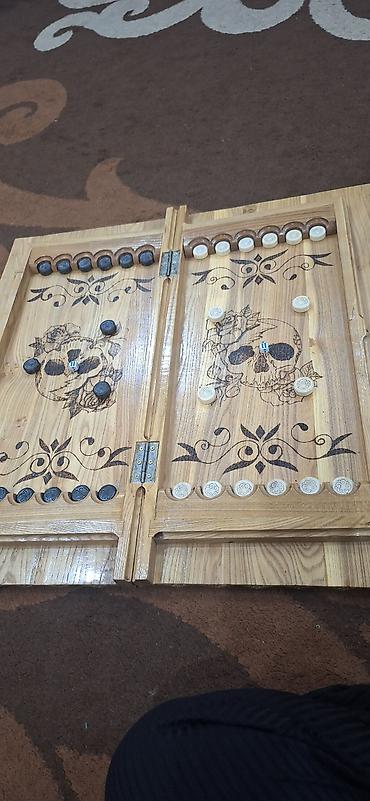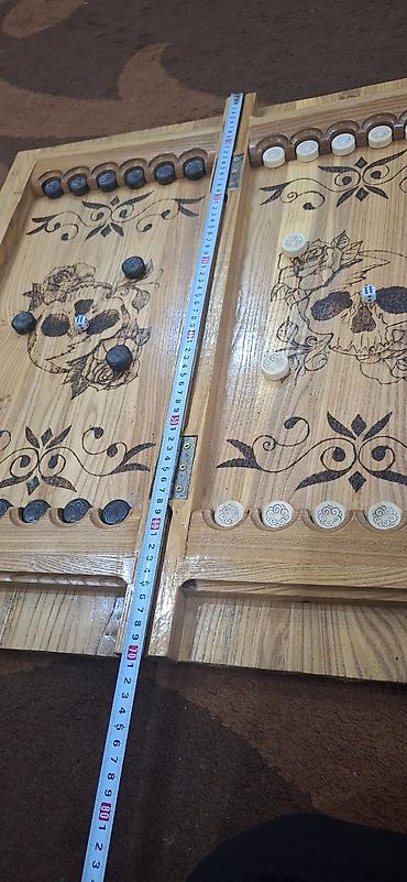 - Комбинированный набор: внутри поле для нард с лузами и декоративной пирографией (череп и узоры), снаружи — резная шахматная доска.