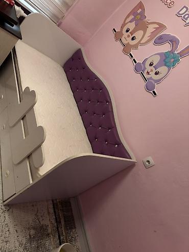 - Кровать-диван с мягким изголовьем (экокожа/винил, стёжка «каретная» с декоративными пуговицами, цвет – сиреневый). Съёмные защитные бортики. Под спальным местом — выкатные ящики для белья.
