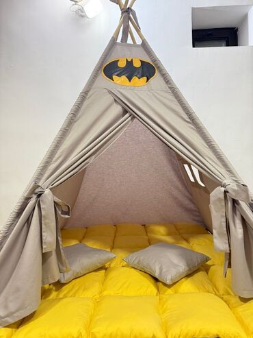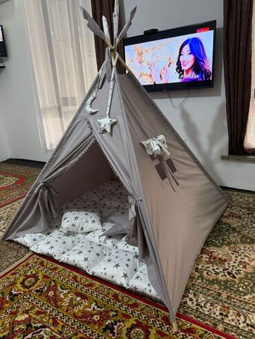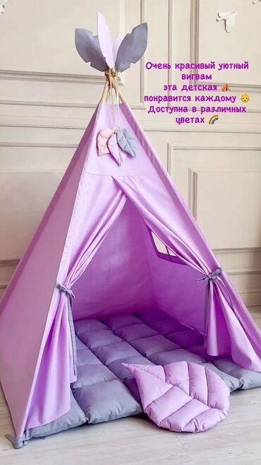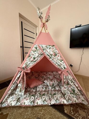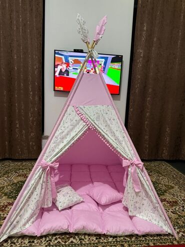 - Формат: классический tipi на устойчивом каркасе из деревянных реек, верх украшен декоративными «перьями» и бантиками.